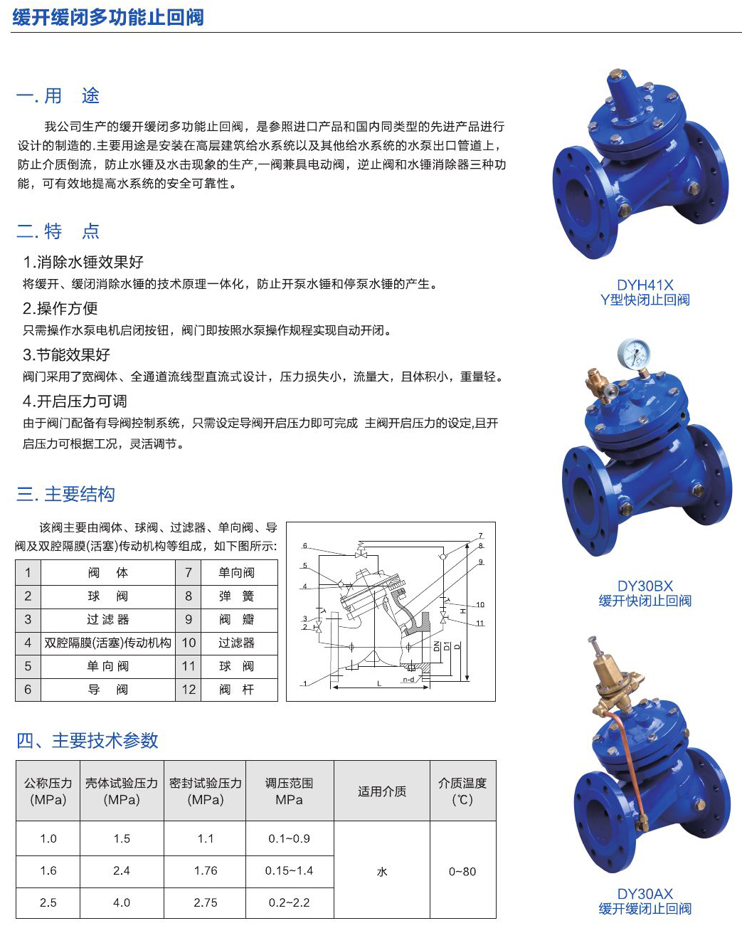 安裝在高層建筑給水系統(tǒng)以及其化給水系統(tǒng)的水泵出口管道上,防止介質(zhì)倒流,防止水錘及水擊現(xiàn)象的生產(chǎn),一閥兼具電動(dòng)閥,逆止閥和水錘消除器三種功能,可有效地提高水系統(tǒng)的安全可靠性。