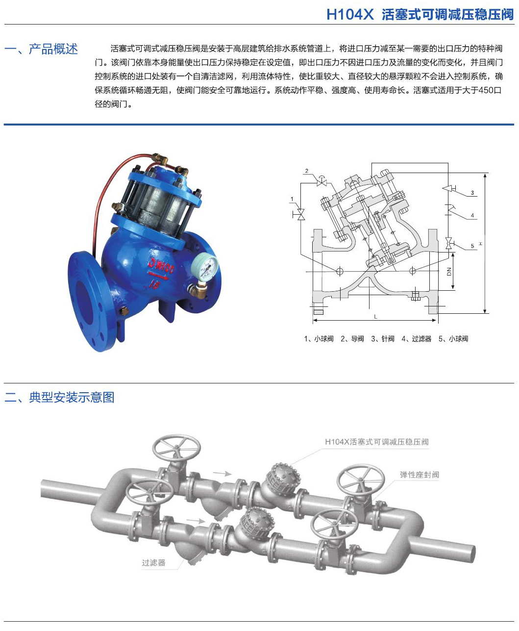 活塞式可調式減壓穩壓閥是安裝于高層建筑給排水系統管道上,將進口壓力減至某一需要的出口壓力的特種閥門。