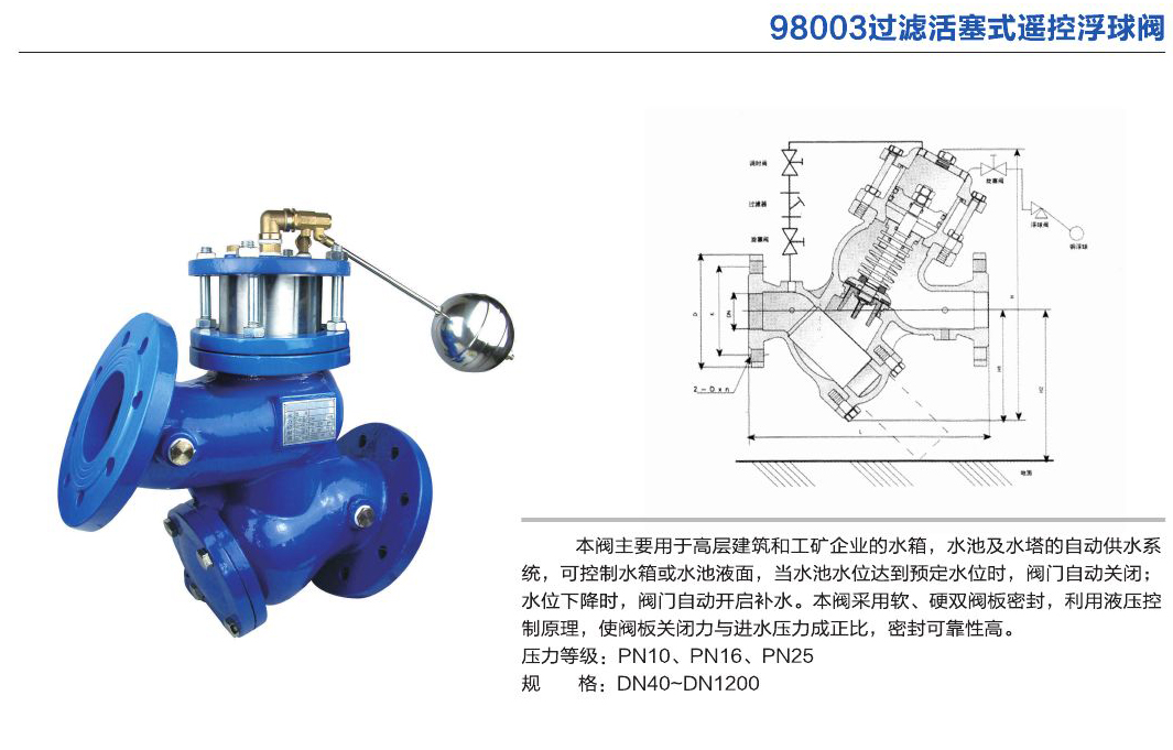 主要用于高層建筑和工礦企業的水箱,水池及水塔的自動供水系統,可控制水箱或水池液面,當水池水位達到預定水位時,閥門自動關閉,水位下隆時,閥門自動開啟補水。