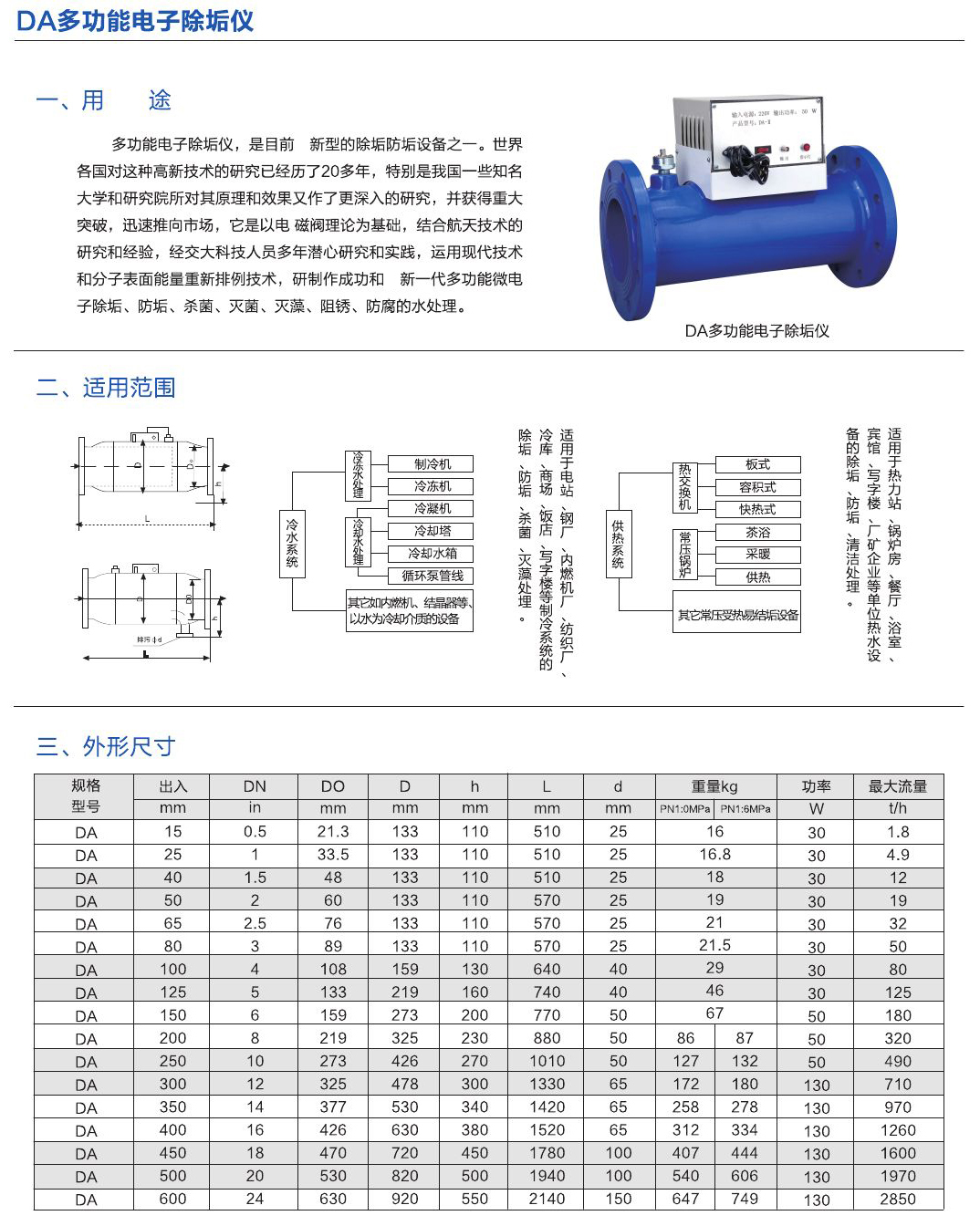 多功能電子除垢儀,是目前新型的除垢防垢設備之一。世界各國對這種高新技術的研究已經歷了20多年,特別是我國一些知名大學和研究院所對其原理和效果又作了更深入的研究,并獲得重大突破,迅速推向市場,它是以電磁閥理念經為基礎,結合航天技術的和經驗,經交大科技人員多年潛心研究和實踐,運用現代技術和分子表面能量重新排例技術,研制作成功和新一代多功能微電子除垢、防垢、殺菌、來菌、來藻、陰銹、防腐的水處理。