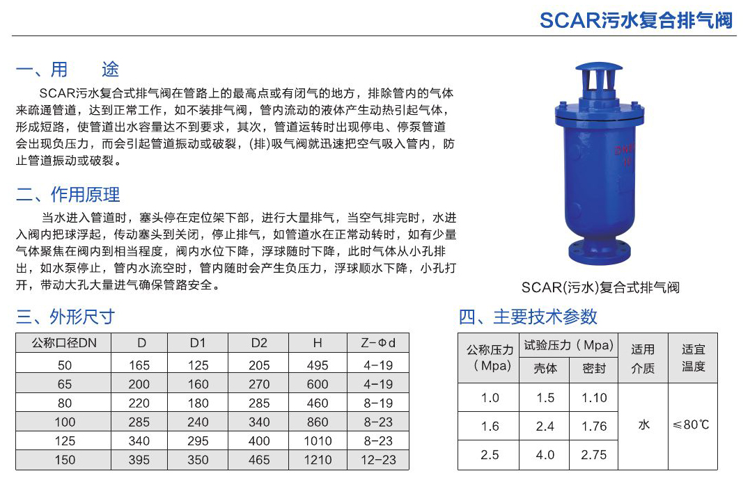 SCAR污水復合式排氣閥在管路上的高點或有閉氣的地方,排除管內的氣體通管道。