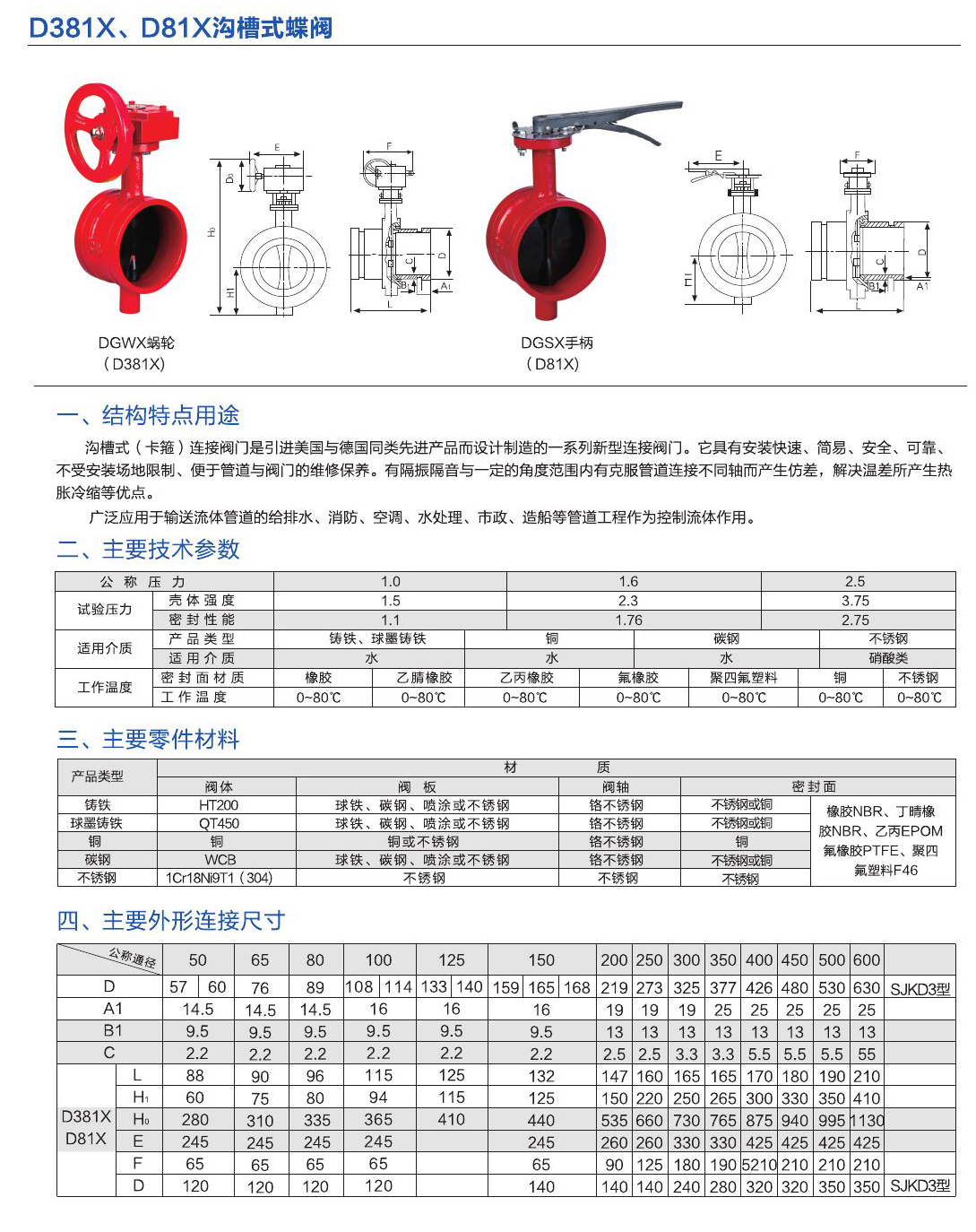 溝槽式(卡箍)連接閥門是引進美國與德國同類先進產品而設計制造的一系列新型連接閥門。它具有安裝快速、簡易、安全、可靠、不受安裝場地限制、便于管道與閥門的維修保養。有隔振隔音與一定的角度范圍內有克服管道連接不同軸而產生仿差,解決溫差所產生熱賬冷縮等優點。