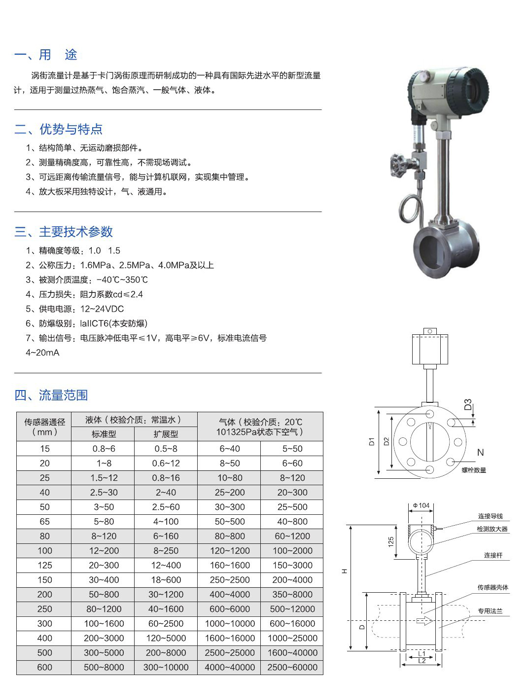 渦街流量計是基于卡門渦街原理而研制成功的一種具有國際先進水平的新型流量計,適用于測量過熱蒸氣、飽合蒸汽、一般氣體、液體。