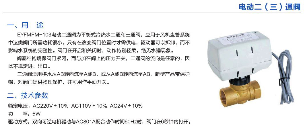 LGDZFM-103電動二通閥為平衡式冷熱水二通和三通閥,應用于風機盤管系統中這類閥門所需功耗很小,只有在改變閥門位置時才需供電,驅動器可以拆卸,而不影響水系統的完整性