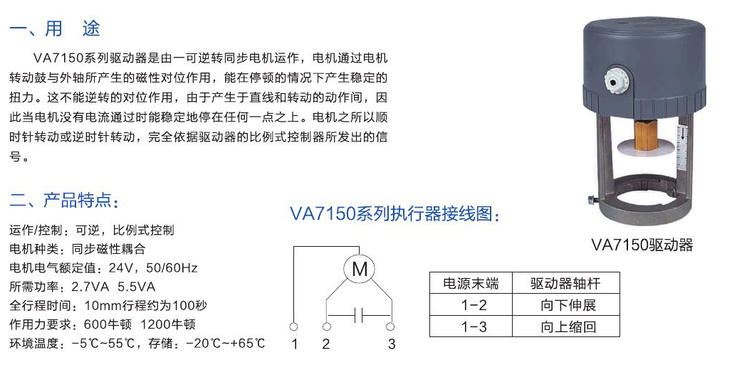 VA7150系列驅動器是由一可逆轉同步電機運作,電機通過電機轉動鼓與外軸所產生的磁性對位作用,能在停頓的情況下產生穩定的扭力。