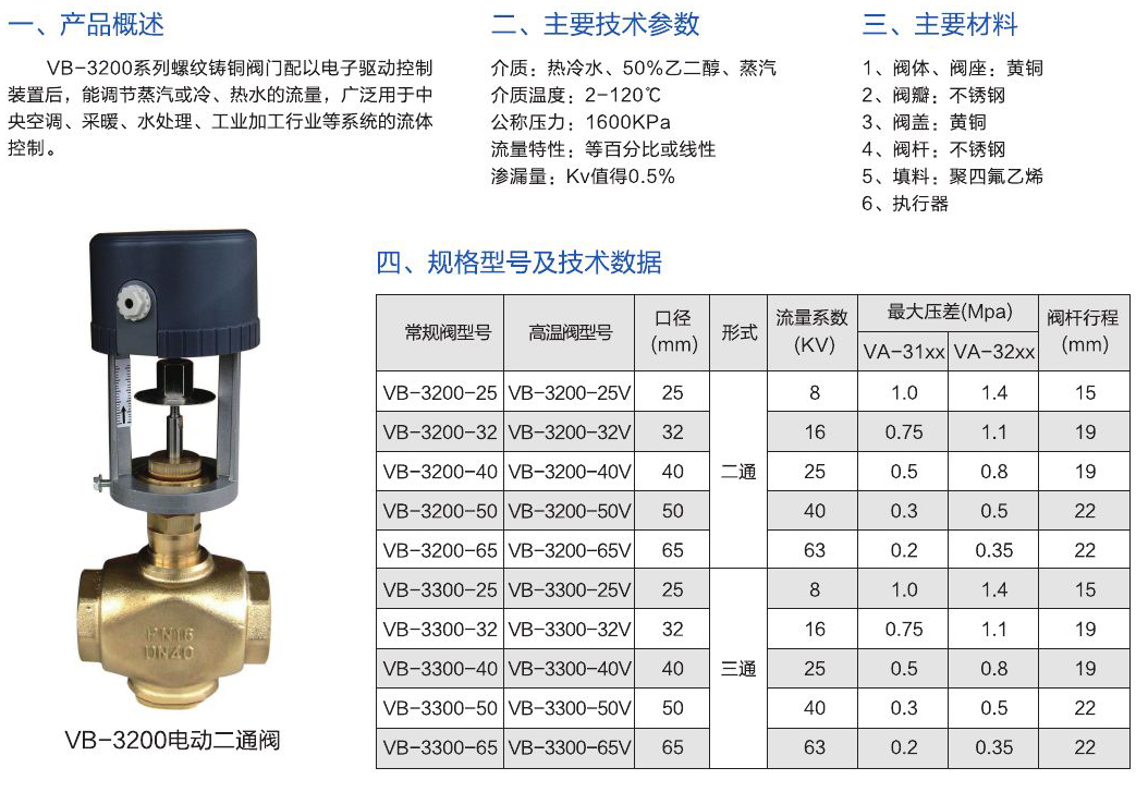 VB-3200系列螺紋鑄銅閥門配以電子驅動控制裝置后,能調節蒸汽或冷、熱水的流量,廣泛用于中央空調、采暖、水處理、工業加工行業等系統的流體控制。