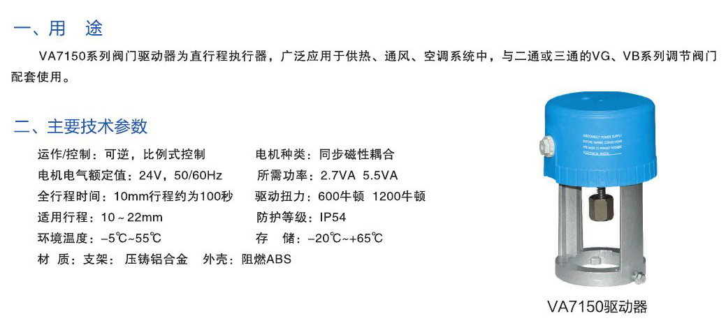 VA7150系列閥門驅動器為直行程執行器,廣泛應用于供熱、通風、空調系統中,與二通或三通的VG、VB系列調節閥門配套使用。