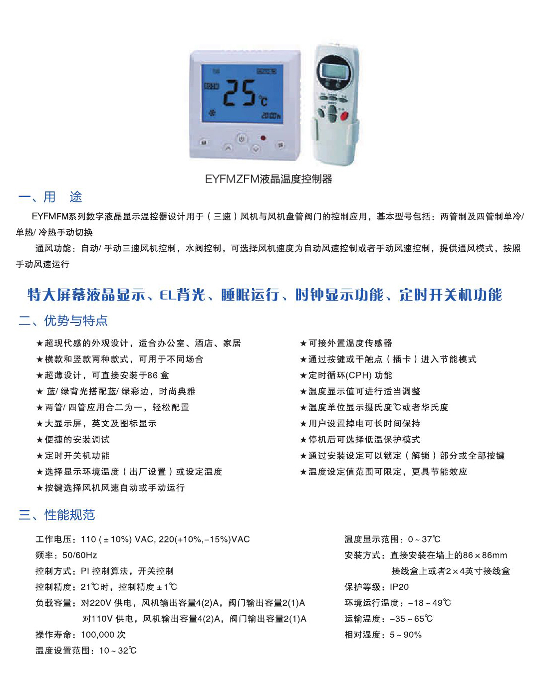 LGDZFM系列數字液晶顯示溫控器設計用于(三速)風機與風機盤管閥門的控制應用,基本型號包括:兩管制及四管制單冷/單熱/冷熱手動切換